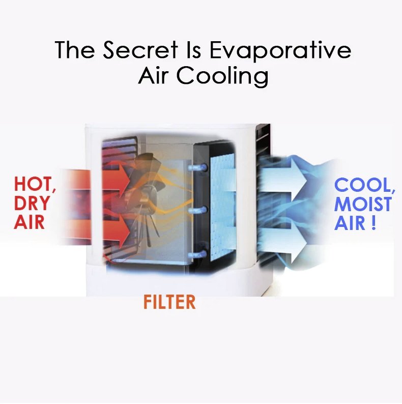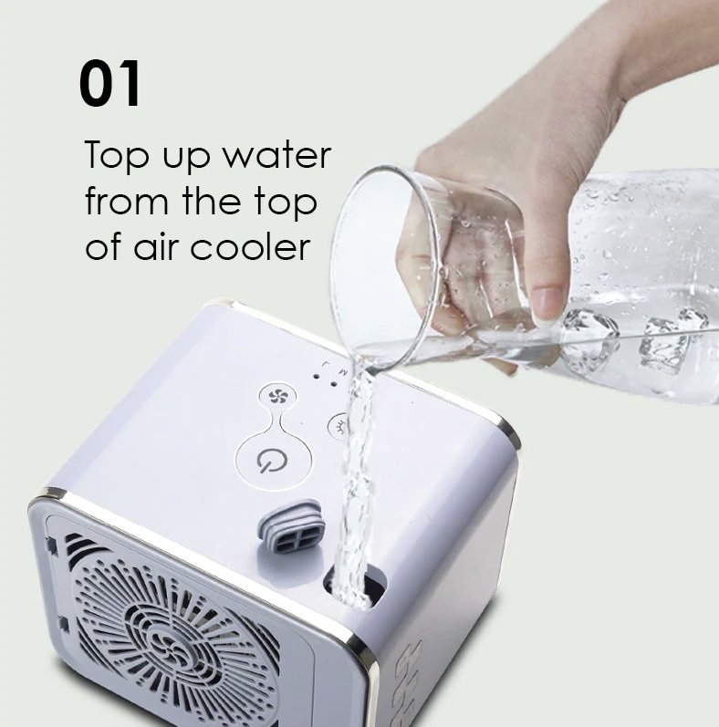 El mini aire acondicionado USB se puede utilizar como mini aire acondicionado, humidificador, purificador de aire y resuelve muchos problemas en verano. El aire humedecido aumenta la humedad del aire y mantiene la piel húmeda. Para un efecto más eficaz es mejor añadir algo de hielo y agua.