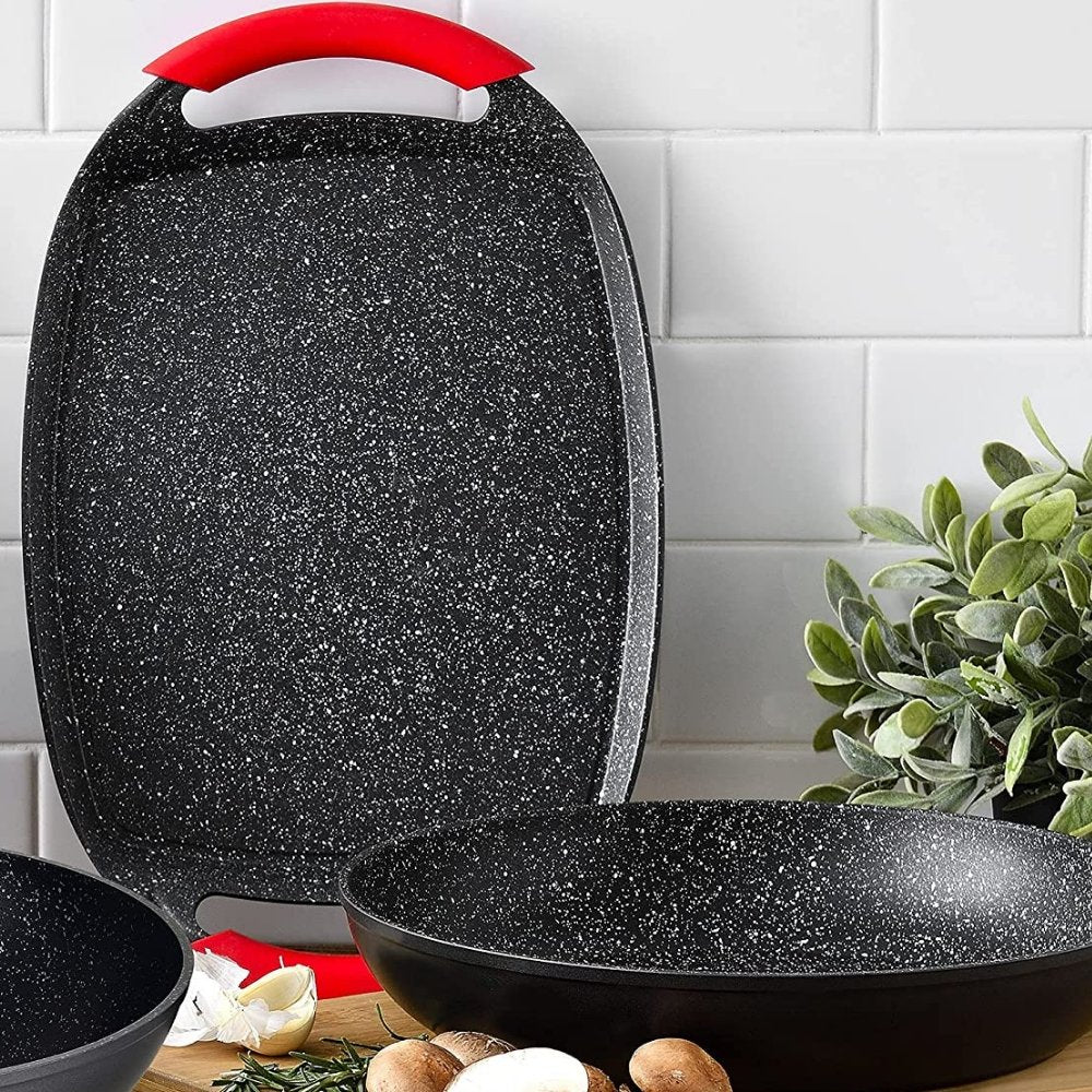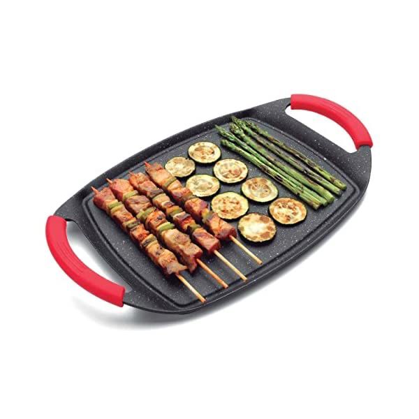 El revestimiento de piedra asegura la máxima antiadherencia. Podrás preparar comida saludable y con menos aceite, sin que los alimentos se queden pegados a la superficie cocinado. Con esta plancha de asar podrá preparar deliciosos platos. Puede asar sin necesidad de poner aceite, lo que es ideal para una alimentación sana o para seguir dietas.