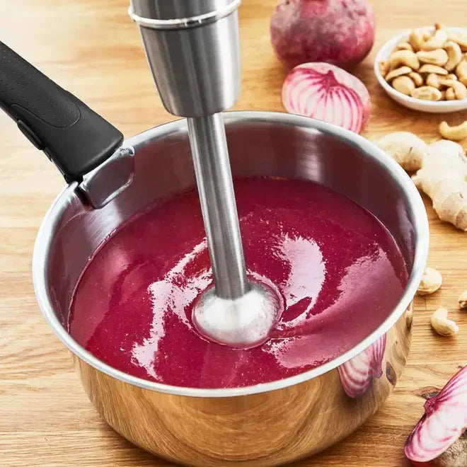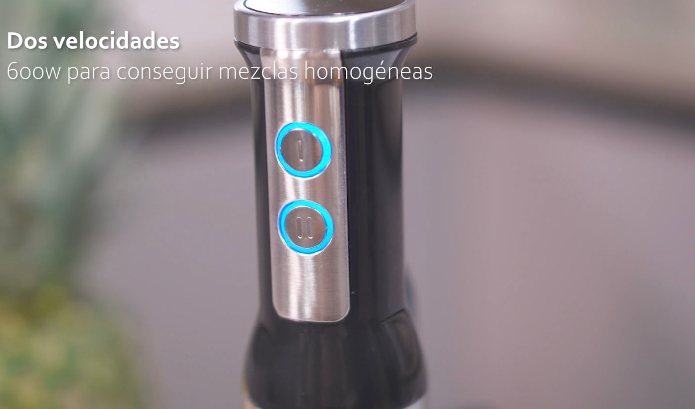 Descubre la fuerza de esta batidora de mano con tan sólo pulsar un botón. 600W que podrás regular con su indicador Led. Además de la potencia regulada, la batidora cuenta con un botón Turbo para hacer de este procesador de alimentos una herramienta indispensable en tu cocina.